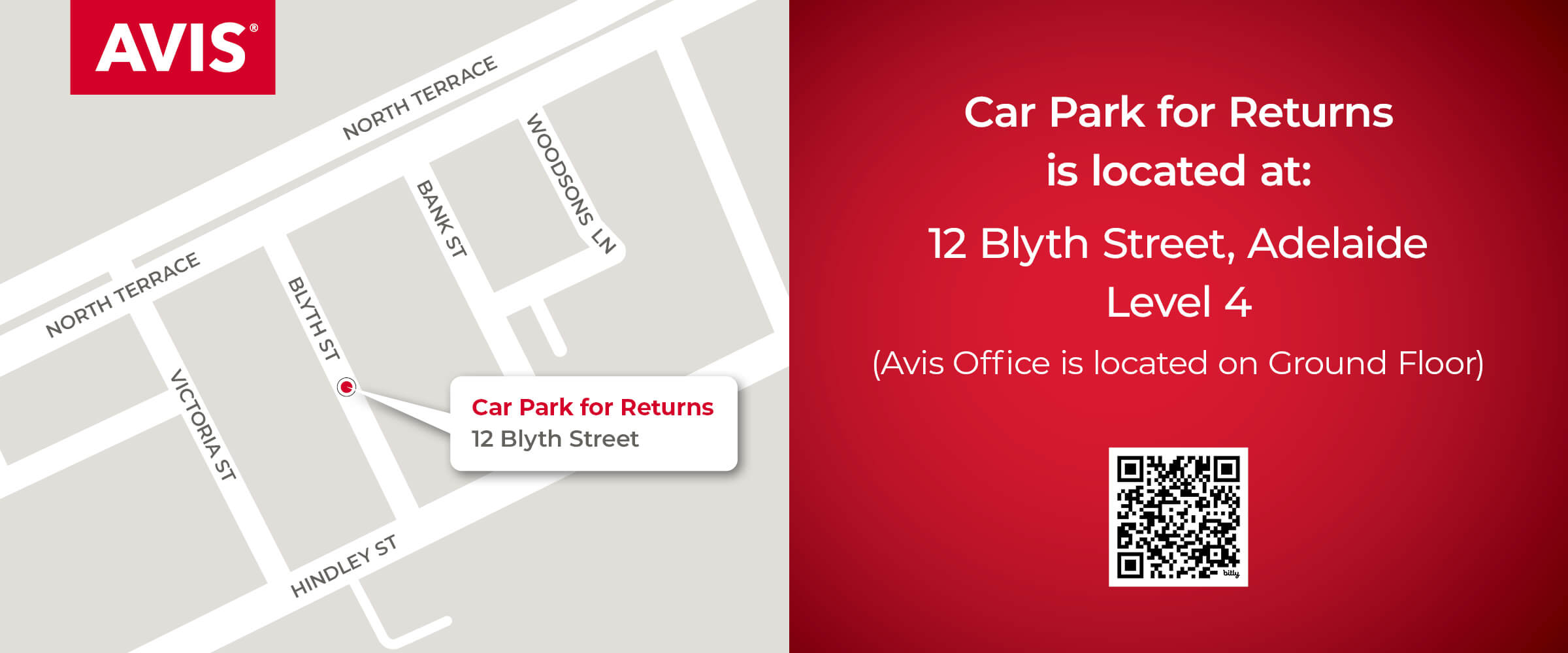 Car park for returns is located at Level 4, 12 Blyth St, Adelaide, 5000, SA. The Avis office is located on the ground floor.